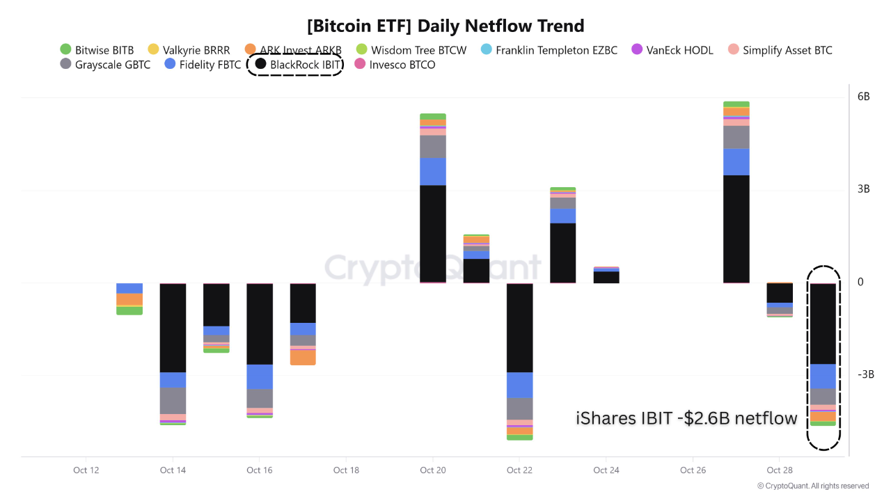 Source: CryptoQuantIf these funds were indeed moving to the spot exchange, that could be the reason for the sudden surge in selling pressure. Surprisingly, the ETF fund flows showed a pattern that contradicted price logic: selling on October 22nd was followed by a price increase, while buying on October 27th was followed by a drop below $107,000.