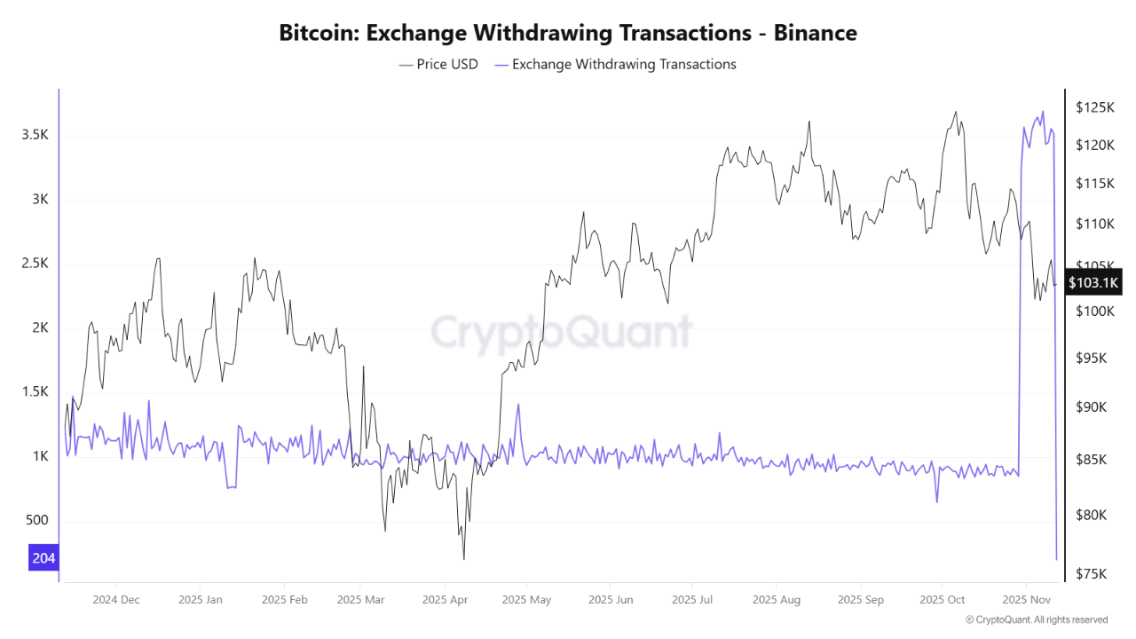 According to data from XWIN Research Japan on CryptoQuant, in early November, Binance recorded a significant spike in Bitcoin withdrawal transactions, one of the largest in 2025.