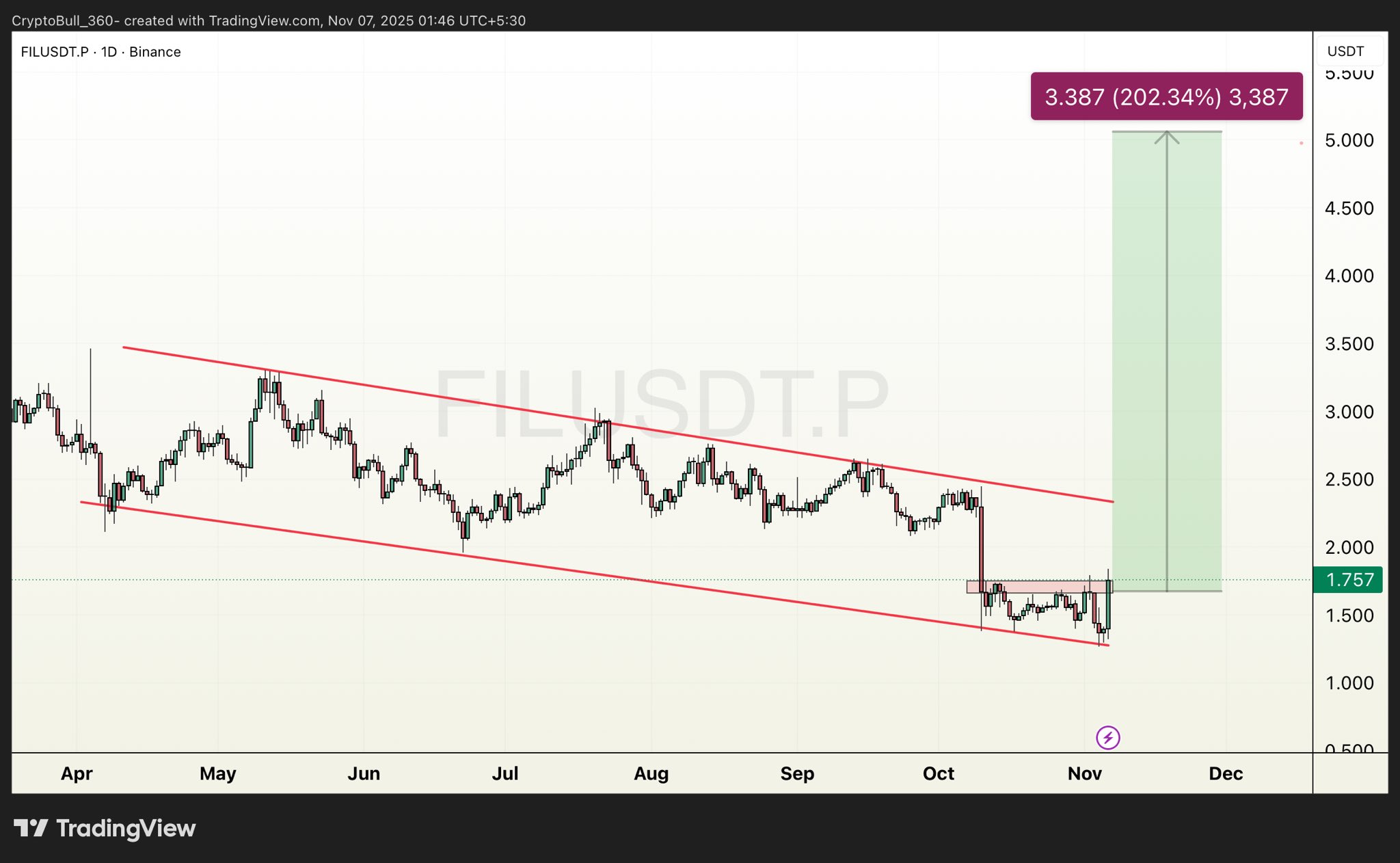 According to analysis from CryptoBull, FIL is currently within a descending channel pattern, which has served as a key consolidation area for the past few weeks.