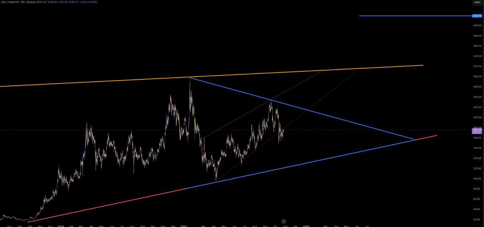 Solana (SOL) is back on the radar after its technical chart revealed a pattern rarely seen in the crypto market: a large symmetrical triangle approaching a crucial point.