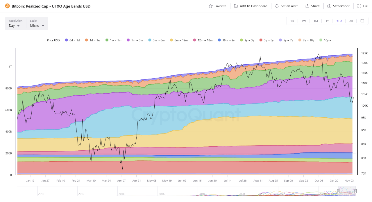 On the other hand, on-chain data shows a shift in ownership from weak to strong hands. UTXO Age Bands show that coins held for more than three years now dominate the realized value, while short-term holdings have declined dramatically. This pattern occurred at the bottom of the 2019 and 2020 cycles.