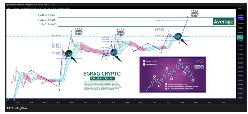 The chart also reflects the distinct cyclical rhythm of XRP’s price behavior over the years. Each major impulsive phase (waves 1, 3, and 5) has always been followed by smaller corrective waves (2 and 4), a structure that continues to repeat with precision.